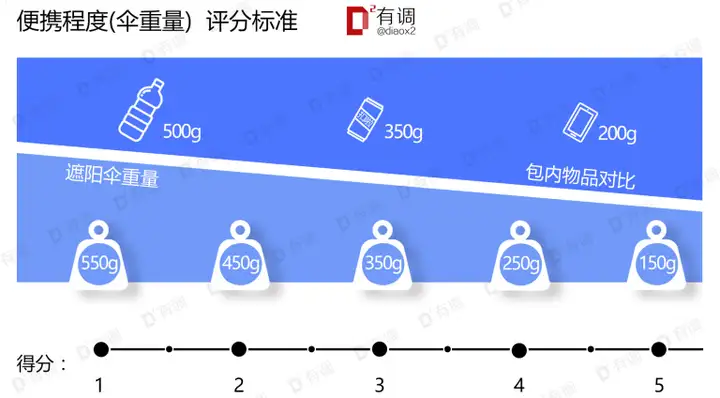 总分=防晒性能x0.4+便携性x0.3+隔热性能x0.1+抗风性x0.1+易用性x0.1,满分5分。