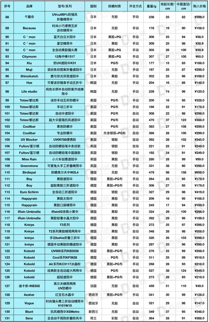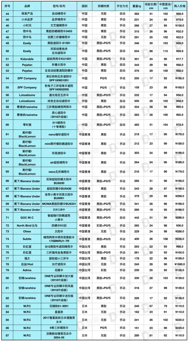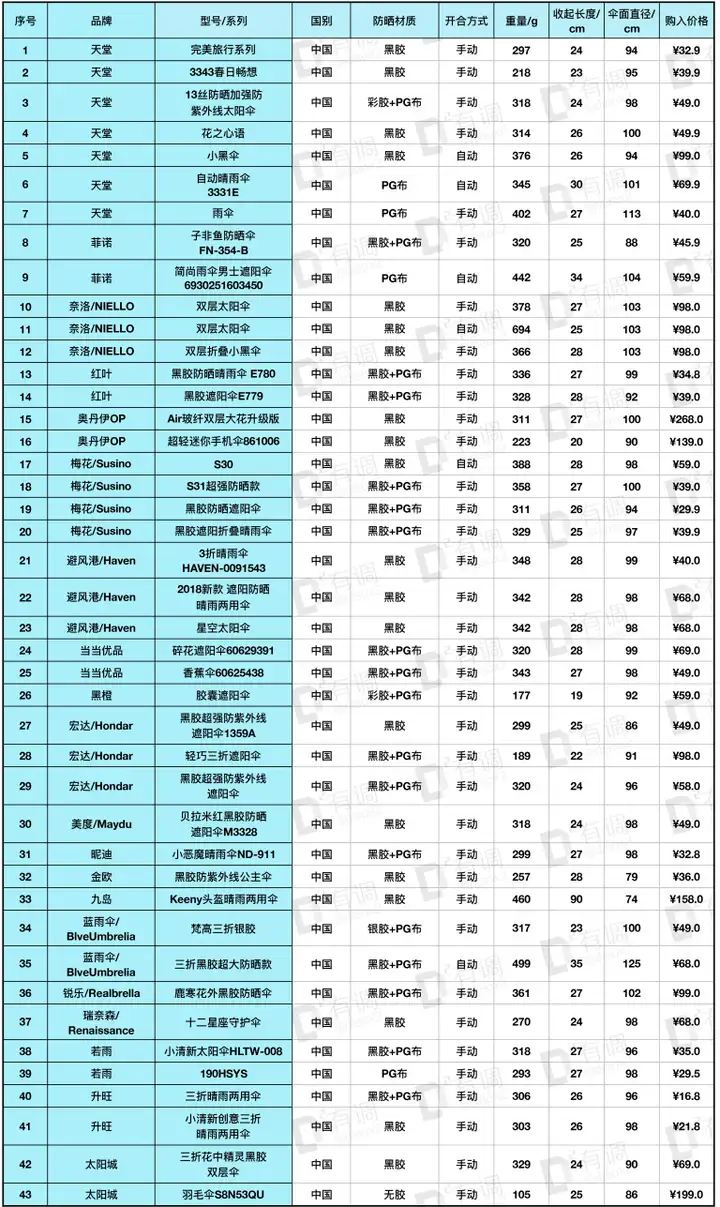 从范冰冰同款光疗伞,到小时候大家都用过的天堂和红叶,再到专业防晒品牌Coolibar、Euro Schirm,还有大众品牌蕉下、黑柠檬等,以及某宝不知名的销量爆款,全部都有入选到本次评测。