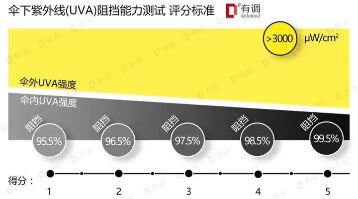 防晒性能计分达4.0,即紫外线遮挡率不低于98.5%。隔热性能计分达2.5,即伞内外温差不小于5℃。不难用,即易用程度不低于3分。# 购买指导
